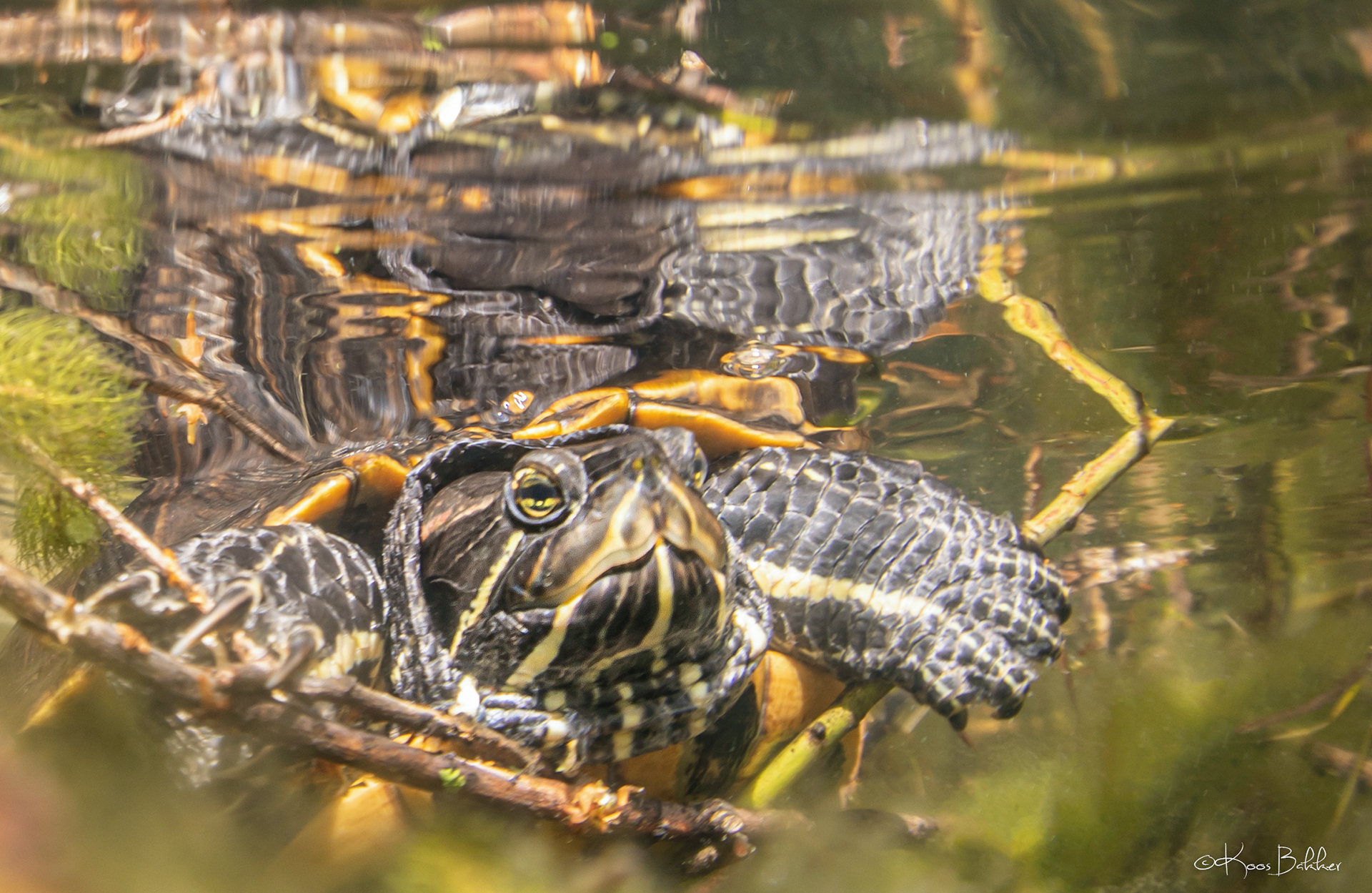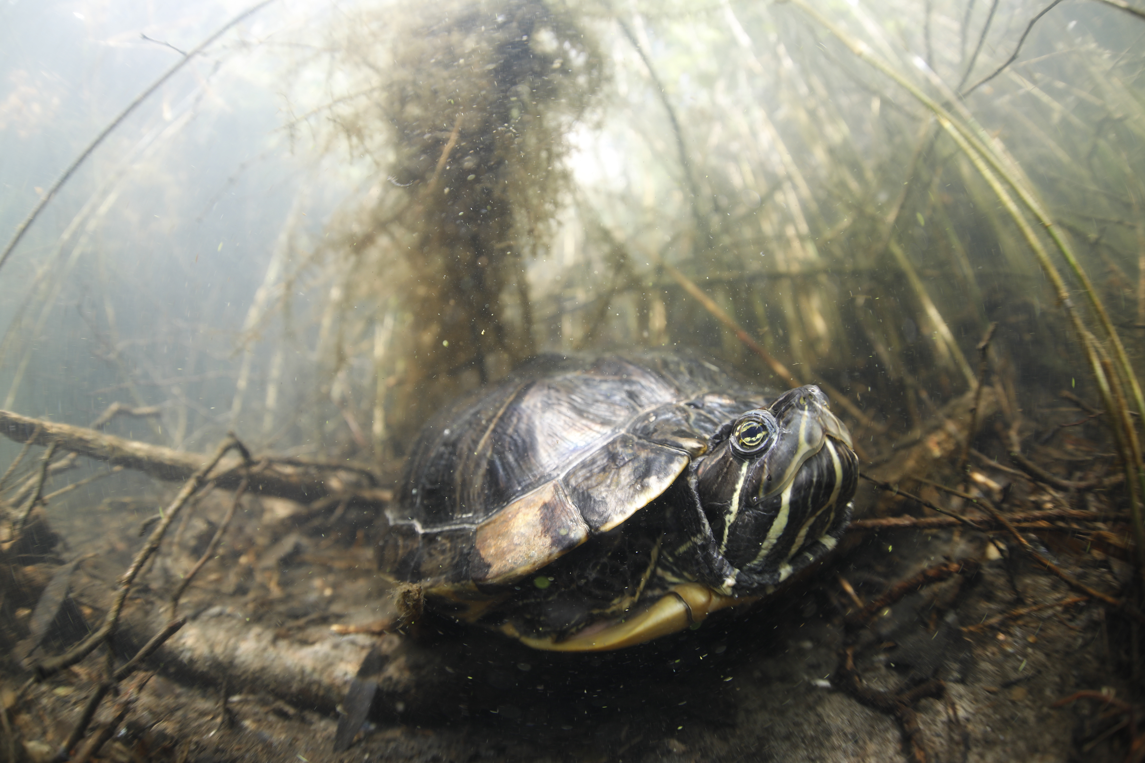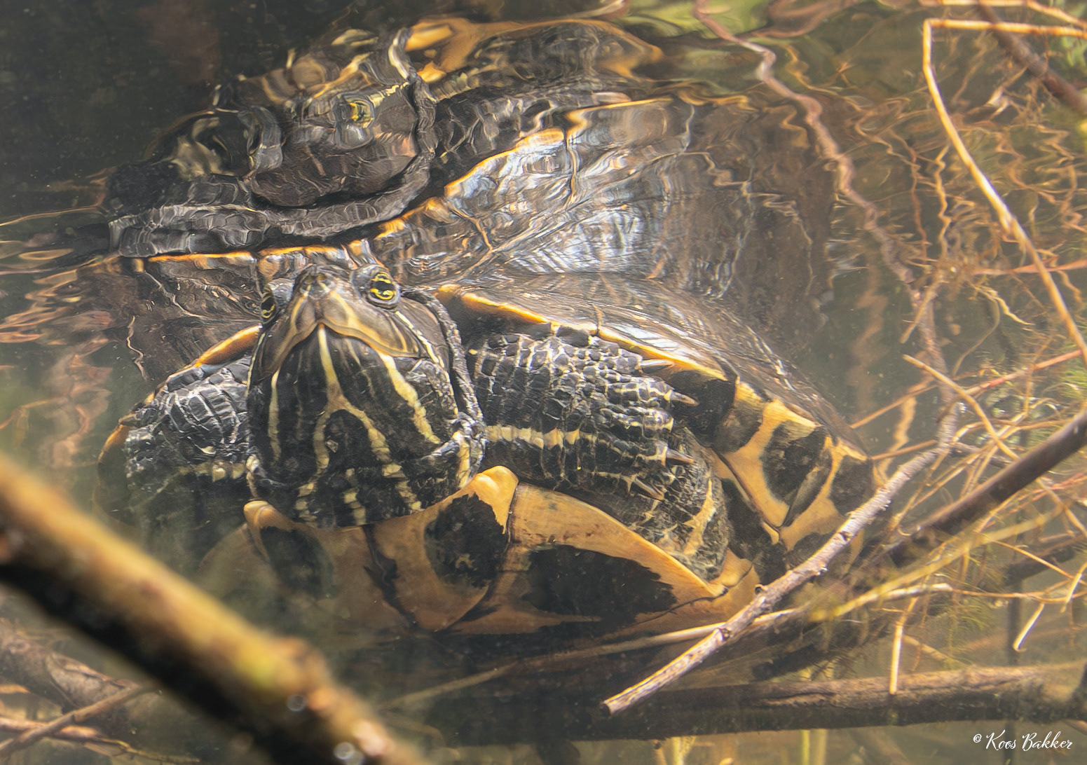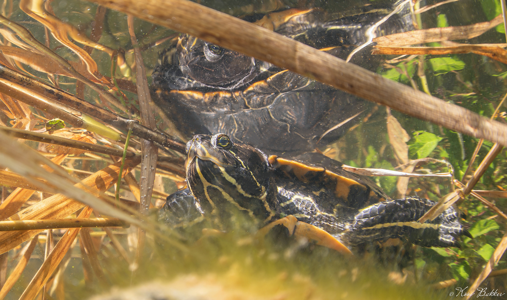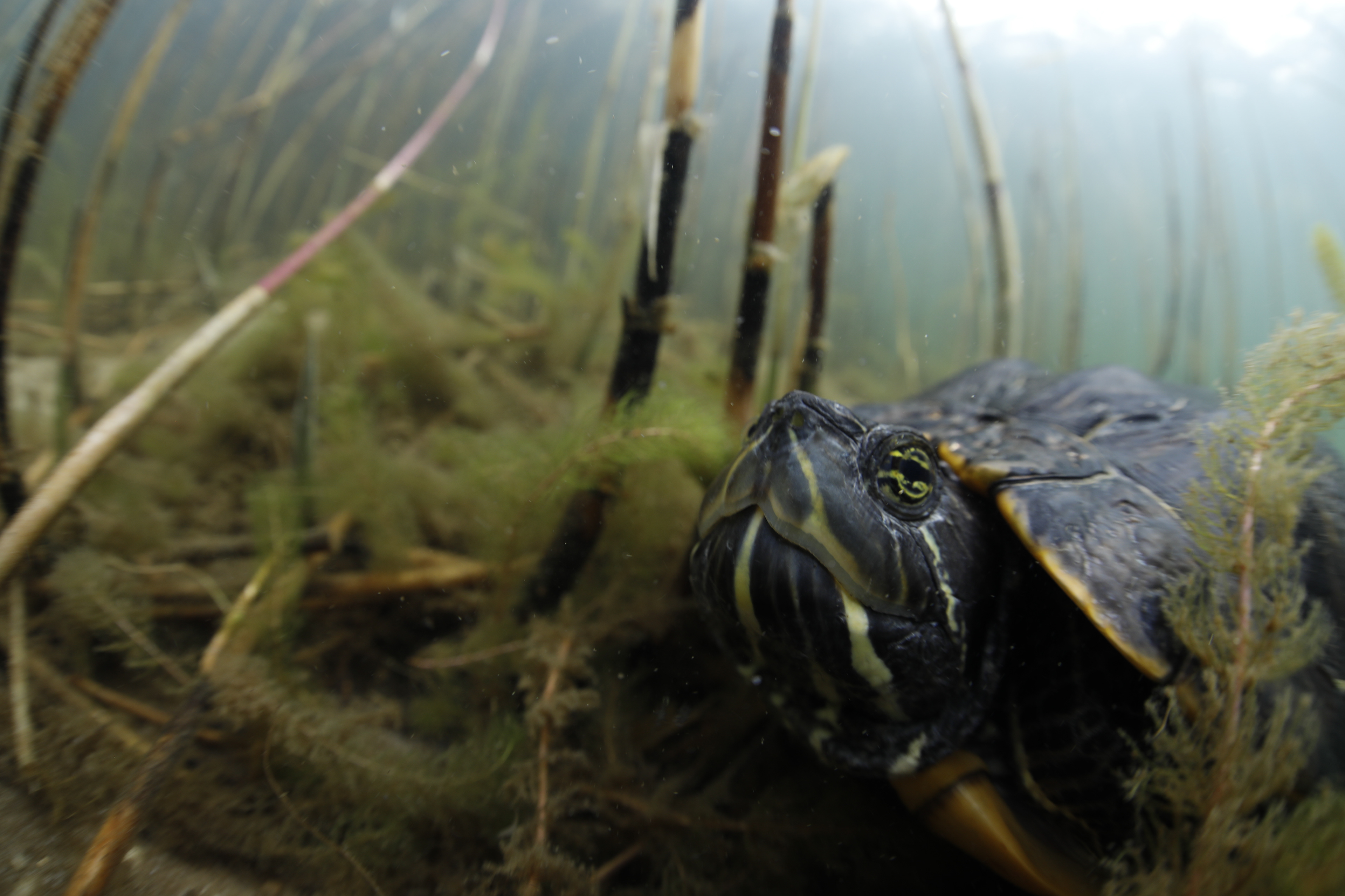 Roodwangschildpad (Trachemys scripta elegans), Geelwangschildpad (Trachemys scripta troostii) en Zaagrugschildpad (Graptemys pseudogeographica) in het Veenmeer te Tynaarlo