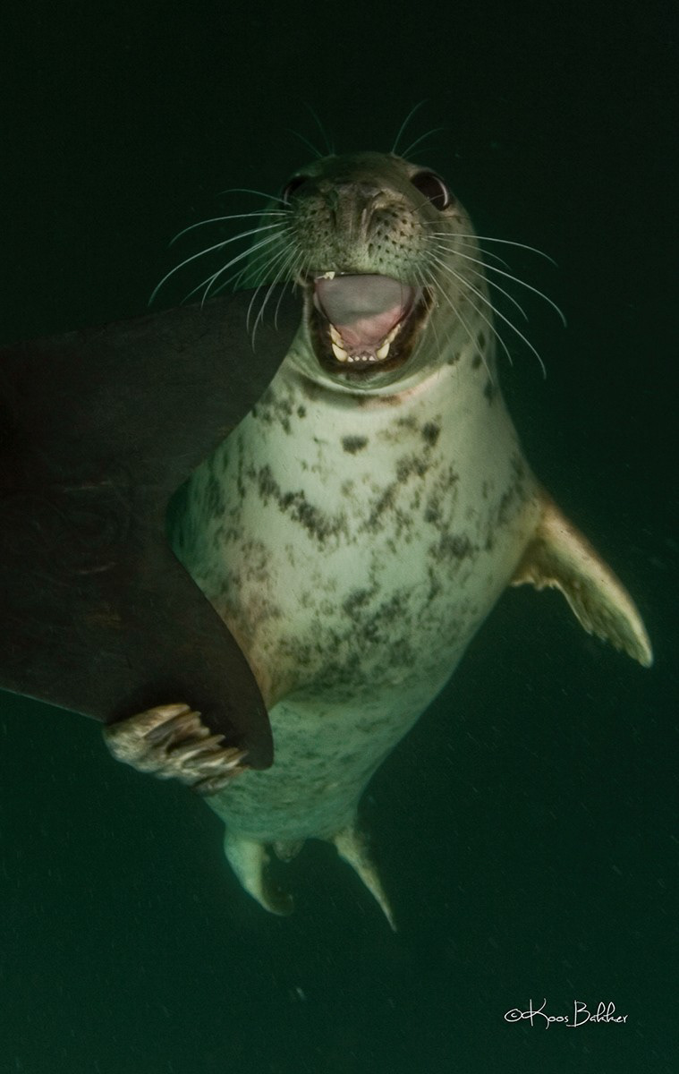 Zeehonden, zowel onder als bovenwater. Onderwaterfotograaf Koos Bakker heeft foto's van zeehonden gemaakt in Farne Islands, Lauwersoog, Zeeland, Noordzee, Waddenzee, Grevelingenmeer, Oosterschelde, Schouwen Duiveland, Spuisluis Brouwersdam